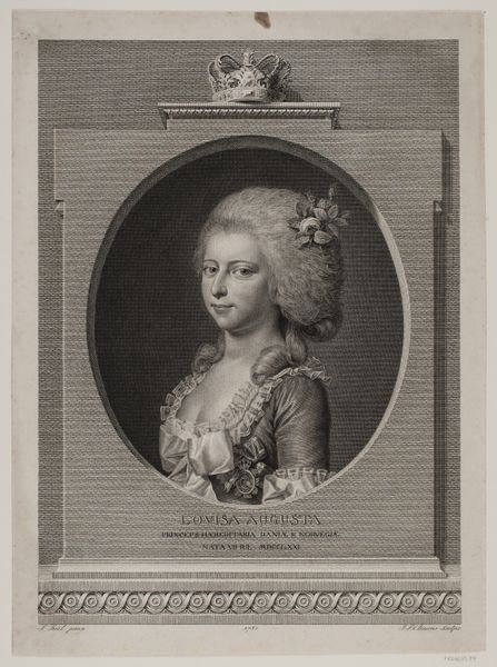 Editor: This print depicts Marie Thérèse, Queen of Hungary, by Gilles Edme Petit. It's incredibly detailed, especially the queen's elaborate gown. What strikes you most about this work? Curator: I notice the strategic use of portraiture to solidify power. Note how Marie Thérèse is presented within this oval frame, almost like a commodity, while Petit's work simultaneously elevates and objectifies her. What does this image say about the role of women in power during this time? Editor: I hadn't considered the power dynamics so explicitly. It's a complex message! Curator: Absolutely. It pushes us to question not only the representation of Marie Thérèse, but also the broader societal structures that dictated such representation. Editor: I see what you mean, I will keep that in mind. Thank you.