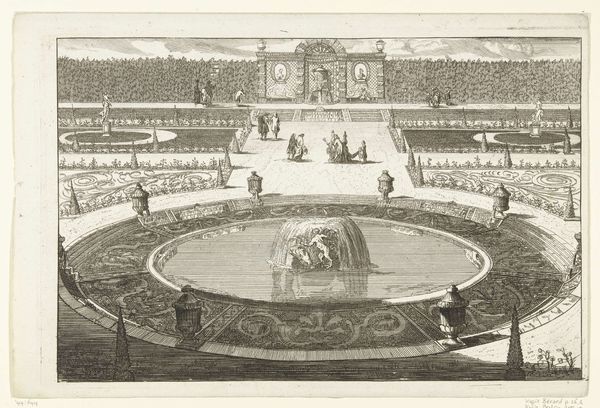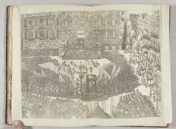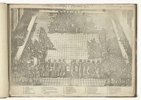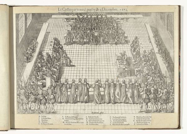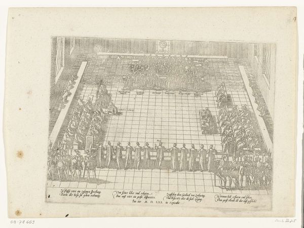 Curator: This is an engraving by Frans Hogenberg, likely produced between 1565 and 1573, titled “Colloquium te Poissy, 1561.” Editor: My first impression is of a meticulously constructed stage. The rigid geometry, especially the grid dominating the scene, feels incredibly controlled, even austere. Curator: It's printed, so this rigidity speaks to the deliberate production method. The creation of multiple impressions and wide circulation were crucial to its purpose: documenting and disseminating information. We should consider how this affects the material value—does its reproducibility alter our perception of its artistry? Editor: I’m more drawn to how the visual order interacts with the symbolism of the event depicted. Look at the rows of figures – each meticulously rendered, their placement indicative of hierarchy and power dynamics. Do you see any underlying narrative here? Curator: Absolutely, though that narrative is embedded within the labor that constructed the engraving. The precise lines were physically etched by someone using metal tools on a metal plate. What can the scale and apparent precision tell us about printmaking traditions of that time? Editor: But what’s more powerful is the way those precise lines come together to depict this historical religious debate. Each figure seems to carry symbolic weight, expressing ideological division in 16th century France. What emotions do you think viewers at the time would attach to them? Curator: Perhaps anxiety? Uncertainty? The rise of printing certainly amplified pre-existing anxieties concerning production methods and cultural authority during that time. Also, it prompts us to consider: Who was this work meant for and how accessible would have the printing plate been? Editor: Perhaps. And maybe also, a sense of hope or resolution or just intellectual fervor? Regardless, it’s striking how the formal composition—the rigid perspective, the serried ranks—enhances that symbolic density. Thank you. This image resonates so strongly through those elements. Curator: Agreed. Looking at the intersection of form and material grounds our interpretation and truly allows for a broader understanding.
