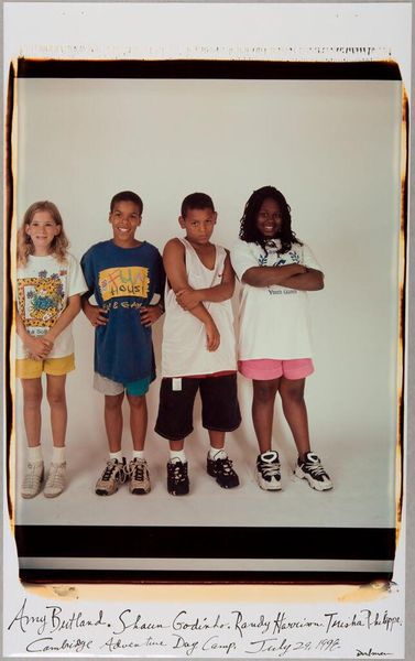 Editor: Here we have Daniel Greene's painting "William Sharpe, St. Kitts." It's a full-length portrait, oil on canvas. The young boy's direct gaze and the work's title bring forward themes of identity and representation, but the Ralph Lauren clothing also adds some confusing symbolism. What historical narratives do you think this painting might be engaging with? Curator: That’s a very astute observation about the clothing, Editor. Let's unpack the tension you've identified. The portrait, seemingly traditional in its approach to realism and figuration, presents us with a young Black boy positioned within, and perhaps against, signifiers of elite American culture. What does it mean to see a child, likely from St. Kitts given the title, adorned in such preppy attire? It challenges the assumed narratives often associated with Caribbean identities. Editor: I see what you mean. So, it's not just a simple portrait; it’s about complex social dynamics? Curator: Precisely! Greene, whether intentionally or not, prompts us to consider issues of globalization, class aspirations, and the politics of representation. How does the global influence of American fashion brands shape identities, especially within post-colonial contexts? The "realism" you noted seems less about pure representation and more about staging a specific kind of encounter. Editor: It definitely pushes back on the idea of a single story of identity connected to place. It feels more fluid. Curator: Exactly! By situating William in this context, the artist asks us to rethink how we perceive Caribbean identities. It highlights the ways in which these communities navigate the complexities of cultural exchange and economic disparities, challenging simplistic notions of identity tied to place. It uses portraiture to explore questions of aspiration, belonging, and the global circulation of images and ideas. Editor: Wow, I hadn't considered all of that. It makes you really question your own assumptions and how we tend to categorize identities. Curator: Absolutely, Editor. Art, at its best, isn't about providing answers but prompting critical self-reflection. Considering how social context interacts with art helps expand understanding of its value.