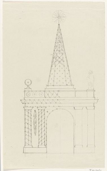 In this 1788 design for the illumination of a house in Amsterdam, Hendrik G. van Raan uses graphite to render architectural ornamentation, evoking a sense of poised anticipation. The symmetrical structure, defined by a central arched gateway flanked by ornate towers, is indicative of both classical and gothic influences. The overall impression is one of lightness, almost as if the structure is more conceptual than tangible. Van Raan’s design utilizes a semiotic interplay of vertical lines and rounded forms. The verticality of the towers suggests aspiration, while the archway provides an opening and an invitation. The repetition of small, circular elements along the edges of the structure creates a rhythm that guides the eye. These elements don’t just decorate; they contribute to a structured visual language, inviting us to decode the intended reception. Ultimately, the drawing prompts us to consider the interplay between public display and private space, using architectural form to negotiate social and aesthetic values. It's a space crafted not just from stone, but from the very language of design itself.