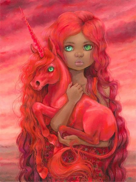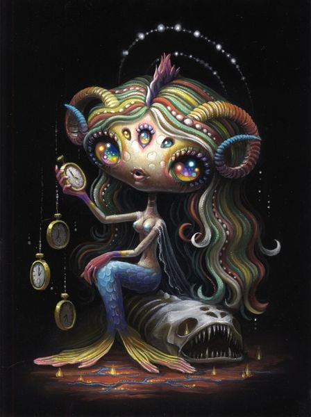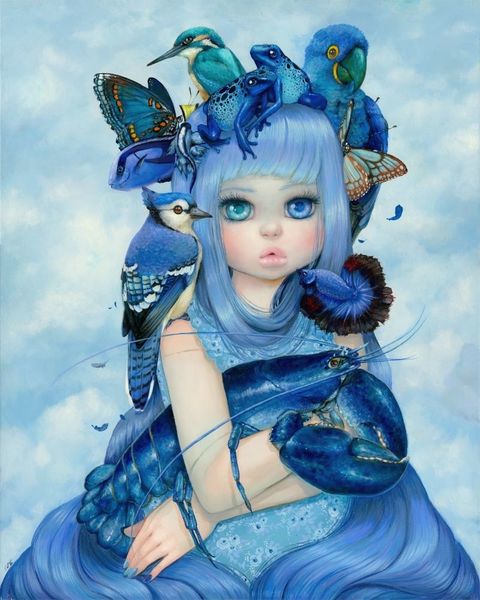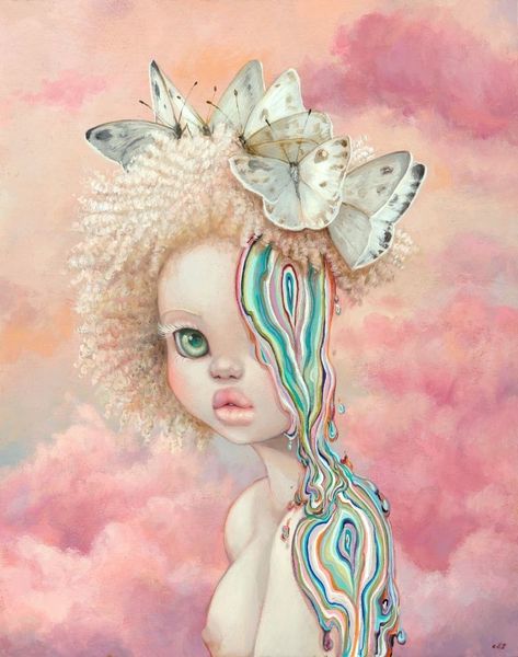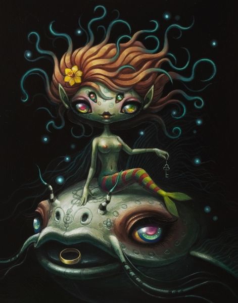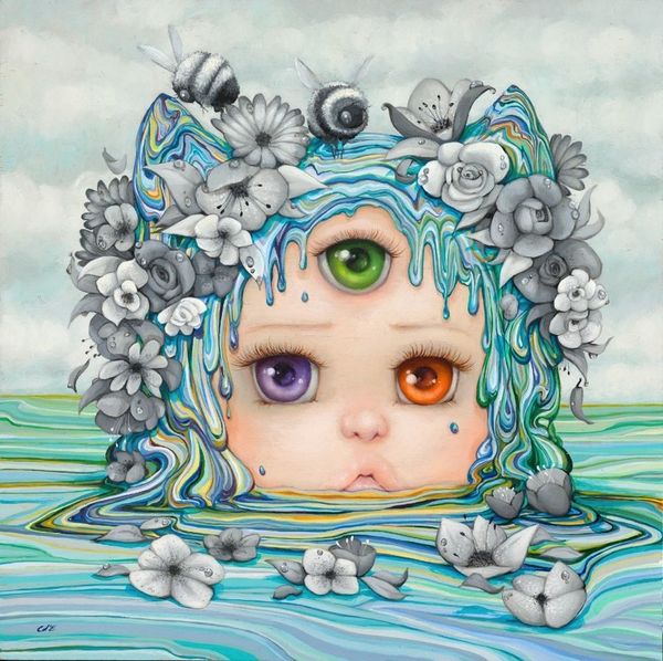 Editor: Right, so we're looking at "My Little Maneater" painted in 2021 by Camilla d'Errico. It’s an acrylic painting and it’s… pretty striking. There’s something about the almost childlike figures that's both captivating and a little unsettling. What springs to mind for you when you look at this piece? Curator: Oh, where do I begin? It feels like stepping into a dream, doesn't it? The work is deeply rooted in this enchanting pop-surrealist style that d'Errico masters. The almost hyper-real eyes, they seem to pull you into some fantastical underwater world. Are they inviting you in, or warning you to stay away? And what about that little "maneater"? Is it creature, familiar, metaphor? A dark passenger maybe? Editor: Dark passenger, that's interesting! I was just thinking it might represent innocence… or maybe corrupted innocence. But is it a cultural thing, this pop-surrealism? I don't know a lot about it. Curator: Well, think of it as this bridge between the accessible language of pop art and the dream logic of surrealism. Artists like d'Errico create these alternate realities reflecting the cultural anxiety, beauty, all those tricky things. See how the textures are super smooth and almost airbrushed? Editor: I do. It’s quite polished, which adds to the strange feeling of it all, I guess. The technical skills almost mask darker meanings? Curator: Exactly! The name 'My Little Maneater' contrasts sharply with the figures themselves, creating a delicious tension, doesn't it? D'Errico is almost challenging us to rethink preconceived notions, using deceptively sweet aesthetics. Editor: That’s fascinating. So, it’s like she's luring us in with beauty but really asking deeper questions? I see it now. Curator: Precisely! The magic of art, right? Layers upon layers. It’s those conversations between the familiar and unfamiliar that create those moments that we will keep thinking about long after we see it!
