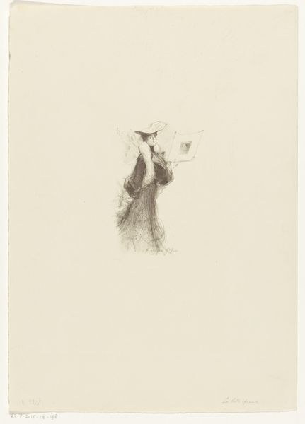 Curator: Let's discuss "De sentimenteele joffer," likely created around 1926 by Hein von Essen. It’s rendered as an etching, exhibiting qualities of both drawing and printmaking. Editor: My immediate impression is of fragility, perhaps even resignation. The upward tilt of the face, eyes closed, evokes a certain melancholy. Curator: The pose, the closed eyes—they speak to a turn-of-the-century aesthetic where emotion and inner states were paramount. You can see the influence of Art Nouveau and Symbolism, movements concerned with expressing ideas that escape everyday rational understanding, a sort of push back from what they may see as an overtly pragmatic era. The emphasis on the line, the delicate shading, enhance this impression. Editor: Yes, there's an intentional move away from hyperrealism. Consider how the figure is framed by that intriguing textured background – almost like a woven tapestry but also casting shadows. Does this texture function as some sort of barrier, as the face looks away and almost attempts to push past it. Curator: That’s a good interpretation. In looking at Von Essen’s placement of that detail we also should think about the context around exhibitions at the time, it’s something to consider that would have given meaning. Looking into how exhibiting imagery from this time gave rise and prominence for certain artists over others could bring context into its production and consumption. It reflects on the rise of psychological introspection during that period, and also what can be a kind of melancholic rebellion against social expectations. Editor: It's interesting that you bring up the social expectations, especially when thinking about women during the early 20th century. Could the expression of sorrow become an accepted outlet within acceptable aesthetic boundaries? The woman isn't overtly confrontational. Curator: Exactly, you know. Her sentiments could be passively rebellious through an artistic gaze. She embodies what society has dictated is right. Editor: Right! Well, considering it from a feminist theory and historic context gives an additional way to view and analyze how society influences an artwork, the message it gives and evokes. Curator: Indeed. Thank you. I find that our differing viewpoints are what can makes art all the more compelling. Editor: Exactly! Thank you. That was an interesting discourse.