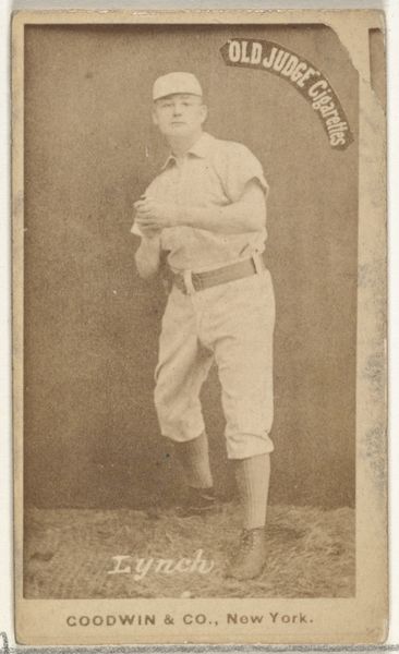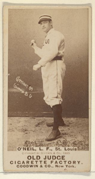 This is a baseball card from the Old Judge series, produced by Goodwin & Company in the late 19th century, featuring Alexander "Colonel" Ferson. The sepia tone, typical of early photography, creates a sense of nostalgia, drawing us into a past era. The composition is divided into distinct horizontal layers: the stark contrast of the player against a gradient background, grounding him in the foreground and emphasizing his figure. The image is structured around diagonal lines, from the player’s outstretched arm holding the baseball to the opposite grounded leg, creating a dynamic tension within the rectangular frame. The limited color palette and the use of light and shadow sculpt Ferson's form, highlighting the texture of his uniform and the focused intensity of his pose. The card functions as both portraiture and advertising, merging the celebration of athleticism with commercial enterprise. The name of the cigarette factory is printed below the baseball player's name, thus reminding us of how cultural values can converge in unexpected ways.