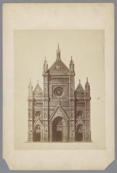 Curator: This photograph captures the facade of the Siena Cathedral in Italy, sometime between 1862 and 1873. The photographer is Paolo Lombardi. He worked primarily with the gelatin-silver print technique. Editor: It has a somewhat dreamy quality, a real sense of faded grandeur. The way the light catches all the little details in the stone is wonderful, it is almost too much though. Overwhelming. Curator: I'd say the effect produced is deeply rooted in the aesthetic values of Romanticism, particularly in its interest in historic architecture and its capacity to evoke powerful emotions. These cityscapes functioned not merely as documents, but as statements about cultural heritage and identity, as seen through a 19th-century lens. The angle puts emphasis on verticality. Editor: Absolutely, that upward thrust gives it a religious feel. The picture, composition-wise, gives us three doors and feels somehow like a heavy, imposing presence in sepia. One cannot imagine being carefree in the presence of this grand construction. And the steps! Do you have to repent to get up to the front door? Curator: I think your reaction is very valid because of what those monumental structures have represented across centuries for various communities, politically or religiously. A Romantic photographer could have sought to capture what he probably perceived to be the sublime essence of Italian architectural genius. Editor: So we are in agreement then? A bit too on the nose? Jokes aside, it’s a good rendering of something… just wondering what? Other than an ornate building? It wants me to ask questions about power structures, money, corruption, you know…fun stuff! Curator: That sense of something both attractive and intimidating surely underscores the complex relationship that we, as contemporary observers, have with such images. The photographer presents a static scene but invites conversations across time, between its history, our present, and our projected future. Editor: Makes you wonder how many stories that façade could tell. Or, maybe how many are actively suppressed by such powerful presences in a community? Thanks for adding your perspective.