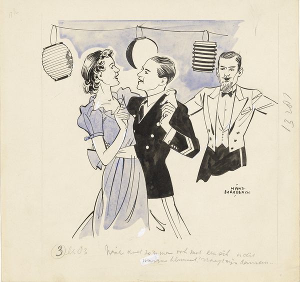 Editor: This lithograph by Théophile Alexandre Steinlen is called "Un Débutant," which I believe translates to "A Beginner." I’m struck by the tension in the scene; there’s definitely an air of apprehension or uncertainty. How do you interpret this work? Curator: It's a beautiful print, capturing a complex dynamic, isn’t it? We have a woman, clearly dressed in some sort of performative garb - what seems to be a stage costume, judging from the large skirt. Her male counterpart stands with hands clasped, his attire and posture both suggestive of a patron or perhaps someone holding some power in the situation. What’s immediately crucial for me is to unpack how Steinlen's piece reflects societal power dynamics related to gender roles and the objectification of women in performance. How does her corseted silhouette impact your understanding of the narrative? Editor: I didn't consciously register it at first, but the corset, as an element of restricting fashion and expectation, seems very pertinent in what looks like a potentially exploitative situation for the performer. Curator: Exactly. The setting also plays a key role; it doesn’t seem quite stage-like but like a liminal backstage area that could serve multiple functions. Do you feel the scene is glorifying this or is Steinlen pointing at this problem with sharp observation and criticism? Editor: Now that I'm considering the tension you mentioned, and his somewhat distant look, the man appears complicit or exploitative rather than supportive. Is Steinlen then positioning himself against these power dynamics by simply highlighting it for us to witness and dissect? Curator: Precisely. The brilliance here lies in its ambiguity and open endedness. Steinlen encourages a contemporary feminist reading. Instead of presenting a singular answer, he demands engagement and discussion surrounding the inequities inherent in the performance space. Editor: This has made me look at the print from an entirely new angle, going beyond just the initial impression of a fleeting moment. I'll definitely keep those cultural and power dynamics in mind for the next work!