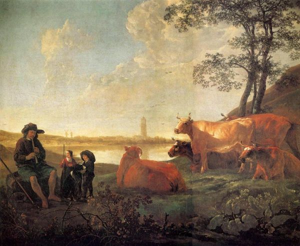 Curator: Károly Lotz's oil painting, "Resting Stud," captures a peaceful pastoral scene, doesn't it? Editor: It certainly does. My immediate impression is one of tranquility, a lull in the day. The figures are arranged to encourage the gaze from left to right, yet balanced from bottom to top. Curator: Right. Let's examine the use of materials. Note the texture achieved through visible brushstrokes, creating depth and movement, especially in the rendering of the horses' coats. Consider also, this is oil paint on canvas, which allows for such blending and manipulation of the medium. Editor: Exactly. The way light falls across the white horse, for instance, is masterfully rendered, emphasizing the structure of its muscles, drawing us to the essence of its form. The tonal variations are extraordinary, with light on top, then progressively dark underbelly shadows, as the horse rests its head grazing in the grass. Curator: And note the positioning of the shepherd; it raises questions. Is Lotz highlighting the social hierarchy between man and animal here? The shepherd idles while the horses graze—a subtle commentary perhaps, on labor. We see his simple clothing as opposed to the majestic horse, and his material circumstance by comparison. Editor: It also points to the underlying class structures of Romanticism. Yet look at how the painting constructs the entire relationship. The color palette also supports this composition of meaning: the earth tones and shades of brown, gold, with blue to match the shepherd to the very earth he rests on. Curator: Ultimately, it makes me consider our present moment, reflecting on work, leisure, and our relationship to the natural world. And who exactly was this "stud"? Editor: For me, the genius here is the use of contrasting colors: it evokes peace, yet makes us appreciate formal balance as the highest priority of art. I wonder if the lack of strong dating hurts or helps its appeal to contemporary tastes?