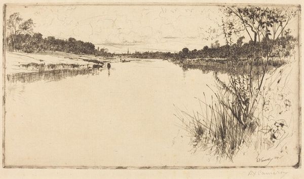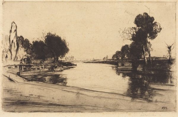 Editor: We're looking at David Young Cameron’s “Landscape with Trees: A Dry-Point” from 1892, done with etching and drypoint. It’s quite a subtle piece; at first glance, I’m drawn to the tranquil, almost melancholic atmosphere. How do you interpret this work, with its quiet stillness? Curator: Tranquil is a perfect word. The landscape breathes with a stillness that's almost a held breath. Notice how Cameron uses drypoint to create soft, velvety darks, especially in those trees reflected in the water. It’s as if the scene is being whispered to us. Have you noticed how the drypoint also adds a sense of immediacy? Editor: I do see that, there's something fleeting about it. I imagine it feels a lot like observing the scene with my own eyes. Curator: Exactly. Cameron wasn't just recording a landscape; he was capturing a mood, an experience. This work whispers of late 19th-century Romanticism but is rendered with a stark modernity through the etching technique. Do you think the lack of bright colours contributes to that atmosphere? Editor: Absolutely! It almost feels drained, like a memory faded with time. I wouldn't describe it any other way. Curator: A memory… beautifully put. For me, this isn’t just a landscape; it's an invitation to wander into a personal, reflective space. Something Cameron's own mind produced as an introspective response to nature. Editor: It’s amazing how a few lines can evoke so much feeling. This artwork is more of an emotional space than I first assumed. Thanks for sharing that perspective with me! Curator: And thank you! It is in seeing things differently that we truly understand the art of seeing.