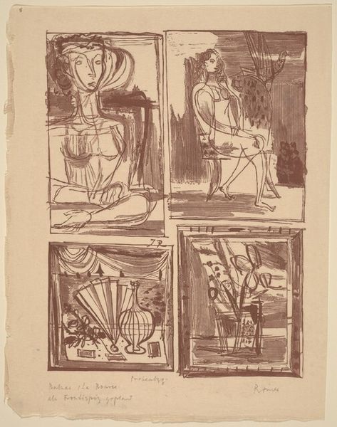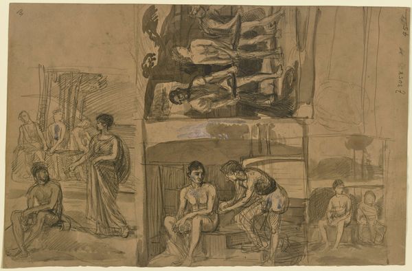 Curator: This drawing, titled "Sitzende und stehende Figuren, ein weiblicher Akt," or "Seated and Standing Figures, a Female Nude," comes to us from Hans von Marées, around 1873. What do you see in it? Editor: It's immediately striking how fragmented it is. It feels more like a series of preliminary sketches layered atop each other than a finished work. The lines are light, exploratory...almost tentative. Curator: Precisely. Marées was deeply invested in a kind of humanist, utopian vision, drawing heavily from the Italian Renaissance in terms of its philosophical foundations. This piece allows us insight into the development of his history paintings and his process. Here we can trace classical forms finding their place in modernity and question why those specific historical points of reference became prominent during the Unification period. Editor: The composition is interesting. The juxtaposition of figures in varying states of completion—some fully rendered, others merely suggested—creates a visual hierarchy. Notice the central figure, the standing nude, her pose and placement anchor the entire drawing. How interesting! Curator: And consider the figures around her: Are they commenting on or participating in the central figure's moment of reflection? Do these echoes of historical styles enhance our understanding of ideal femininity? Marées sought to reconcile the classical ideal with a burgeoning modernity. How can these figures exist within contemporary power structures? Editor: There’s a beautiful contrast between the precision of the nude and the looser rendering of the background. Look at the way the hatching creates depth and volume, drawing the eye deeper into the scene. The strategic use of shadow gives her presence weight. Curator: In unpacking this image, we’re confronted with Marées’ artistic journey, the context that birthed it, and, perhaps, new interpretations that encourage a fresh perspective on historical artwork and its relevance today. Editor: Yes, indeed. Examining this composition helps understand not only the work itself, but our modern reading of proportion, light, and subject within it.