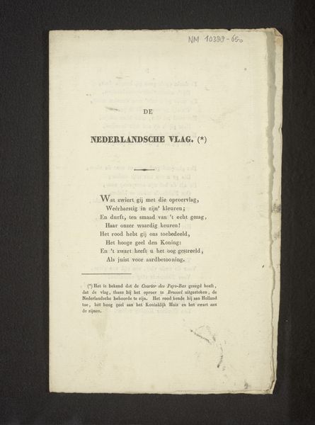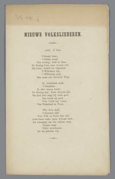 This is "Nieuw Geuzenlied," a song sheet created by C.L. Brinkman, the Dutch writer, poet, and critic, during a time of significant cultural shifts in the Netherlands. The lyrics reflect the complex interplay between national identity and religious beliefs. They express a sentiment against Roman Catholic ostentation, advocating instead for loyalty to the King and country. The phrase "Blij en vrij!" encapsulates the desire for freedom and independence, which resonates with the historical struggles for Dutch sovereignty. The text suggests that religious and political identities were intertwined, with allegiance to the Dutch monarchy symbolizing a rejection of foreign influence. The emotional resonance of this piece is palpable, invoking feelings of patriotism and unity through its powerful verses. Brinkman’s "Nieuw Geuzenlied" captures the mood of a nation grappling with questions of faith, freedom, and national pride.