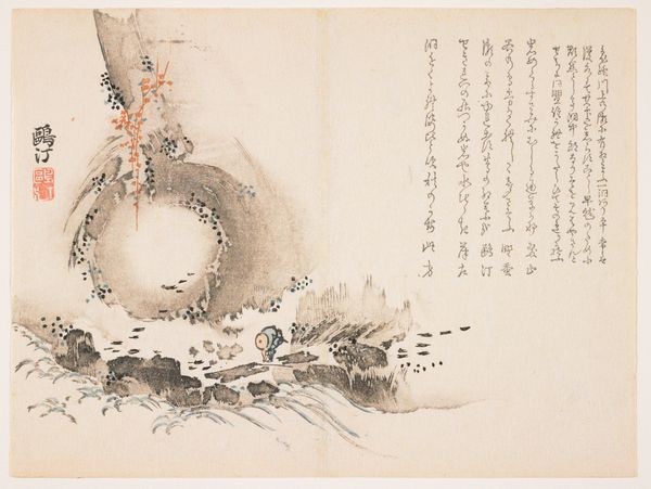 Okamoto Toyohiko made this print of a beach scene through rocks sometime before his death in 1845. Note the inscription to the left of the image which indicates it was part of a collaborative project. This work comes out of a very particular moment in the institutional history of Japanese art. In the 18th and 19th centuries, artists in Japan were increasingly engaging with broader publics, and were supported by arts patronage. Woodblock prints in particular became a popular medium, which allowed artists to make inexpensive works of art that could circulate widely. This print reflects the culture of collaboration and patronage that was developing at the time. We know this because of the inscription which names different people involved in its creation. By studying these inscriptions, and the historical context in which the print was made, we can gain a deeper understanding of the social and economic structures that shaped the art world of 19th century Japan.
