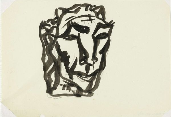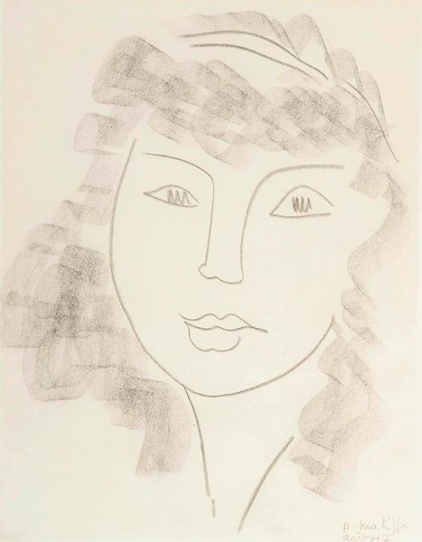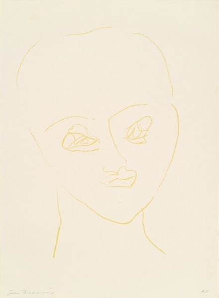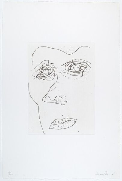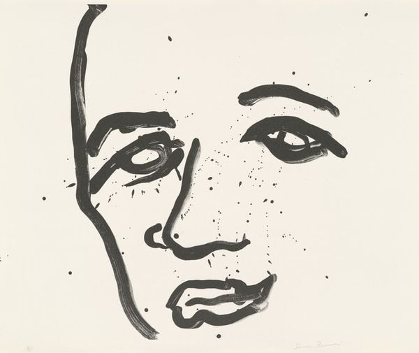 Curator: Sam Francis's "Self-Portrait," created in 1973. The piece employs graphite in a print, presenting a modern and abstract portrayal of the artist. What's your initial reaction? Editor: Striking, unsettling even. The stark lines and intensely dark eyes give the portrait a haunted quality, like a ghostly presence emerging from the paper. Curator: Indeed, the linear quality gives an interesting impression to this self-portrait. The use of graphite allows Francis to achieve a stark contrast between the white paper and the bold lines of the face. Looking at his practice and background as a printmaker, it is evident how crucial materials are to delivering the intended vision in this drawing. Editor: From a formal perspective, it's the composition that captivates. The way he distorts and abstracts his own features creates a compelling tension. Those eyes, particularly—they become focal points, pulling you into the psyche of the artist. It almost verges on the surreal, deconstructing the conventional portrait. Curator: Considering Francis's involvement in modern art movements, the abstraction feels quite fitting. I think this portrait gives us a new perspective to how we analyze themes and materiality of a 'self-portrait' for our understanding, something more than what's usually being delivered through portraiture during that time. It questions the labour of art through a minimalist lense. Editor: I agree, seeing the finished form allows us to reflect how its linear nature allows it to fit with Francis’ history, adding to his story through portraiture’s form and presence. Curator: Exactly. A truly fascinating example of self-representation. Editor: An intense visual statement indeed.