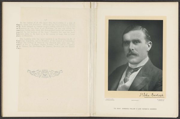 Editor: Here we have a photographic print of Reverend Peter Mackenzie, circa 1874-1884, from an unknown photographer. What strikes me is the framing within the open book and the seemingly candid nature of the Reverend’s pose. How do you interpret this work, considering its context as a historical document and as a representation of Victorian society? Curator: What immediately captures my attention is how this portrait functions as a carefully constructed piece of historical narrative, especially within the broader frame of the book. The adjacent text highlights Mackenzie's perceived qualities, words such as ‘gentleman’, 'courtesy’ and 'chivalry', constructing an ideal of Victorian masculinity closely tied to religious and social status. This resonates with wider discussions around class, morality, and the performative aspects of identity during this period. What do you think about the intentionality behind staging this image? Editor: It seems like the photographer was trying to convey a certain image of the Reverend. Do you think this photograph is successful at depicting this ‘ideal Victorian gentleman,’ or does it reveal more complicated truths about identity and representation? Curator: The power dynamics inherent in portraiture of this era are worth exploring. How complicit was the subject in shaping his own image? It's essential to unpack how class and religious authority shaped individual identity in late 19th century Britain and whose perspectives dominate historical accounts. Considering what isn’t visible or mentioned— the untold stories of the working class or women, or marginalized communities— prompts questions about visibility, power and the construction of historical memory. Editor: That's fascinating. I never thought about it that way. I came into this viewing the image rather simply as a portrait of a clergyman. Curator: Examining portraits like this allows us to delve deeper into the intersections of history, identity and representation, opening discussions about inclusivity, visibility, and the narratives that shape our understanding of the past and present.