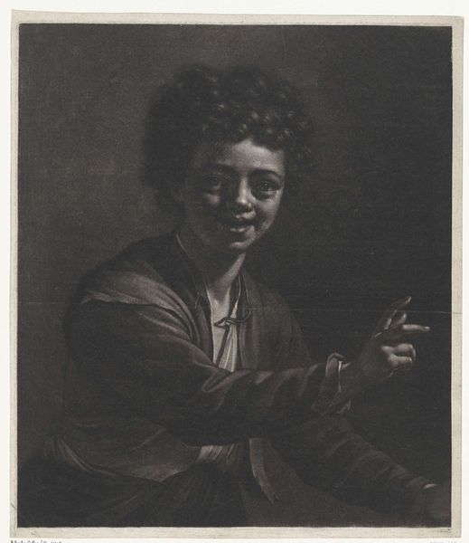 Jan van der Bruggen made this etching, Lachende jongen met krullend haar, sometime between 1649 and 1709. The etching process involves coating a metal plate with wax, then drawing through the wax to expose the metal. Acid is then applied, biting away the exposed lines, which are then inked and printed. The resulting image carries a distinctive texture, with the bitten lines imparting a unique visual quality. Van der Bruggen’s choice of etching speaks to a wider culture of printmaking, where images could be widely disseminated. This particular print, with its informal, almost snapshot-like quality, suggests an interest in capturing fleeting expressions. We see a laughing boy, caught in a moment of mirth. Note the artist's skilled use of line to define the boy's features and convey his lively expression. By emphasizing the artistry inherent in craft, we can move beyond traditional hierarchies and appreciate the rich tapestry of human creativity.
