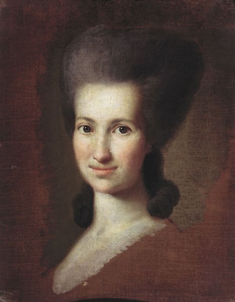 Editor: We're looking at Fyodor Rokotov's "Portrait of Alexandra Struiskaya," painted in 1772. It's oil on canvas. There's a certain delicate sadness to her expression. What emotional symbolism do you read into this portrait? Curator: Notice the soft, almost dissolving edges, and the way the light caresses her face. This wasn't just about recording likeness; Rokotov sought to capture inner character, the ‘soul’ if you will. In this era, the burgeoning Rococo style celebrated the individual. Alexandra’s gentle gaze isn’t simply her own, it's an echo of feminine ideals of the time - purity, virtue and a melancholic sensitivity that society prized. Does the tear-shaped pearl suggest a hidden sorrow? Editor: It does seem deliberate. Is it common to see symbols of sadness or perhaps lost innocence in portraiture of this time? Curator: Frequently. The pearl itself has many readings, from purity to tears. But context matters. Rokotov was a master of emotional nuance. The way he subtly models her face suggests an inward contemplation. He isn’t simply painting a face; he’s giving us access to an idealized, yet vulnerable, version of womanhood. She exists on the precipice of societal expectation. The light symbolizes not just enlightenment ideals, but perhaps also exposure to them. Editor: So, the symbols work on multiple layers – representing both personal and broader societal ideals? Curator: Exactly! The clothing and jewel are superficial in a sense, representing class, and also the pressures society will have put upon this young woman. The gaze implies a deeper, more individual personhood struggling to be. Editor: This has given me a fresh appreciation of the work! I was stuck on what I interpreted as purely sad, but it contains many complexities. Curator: That's the joy of studying images - their continuous and accumulated layers of cultural memory.