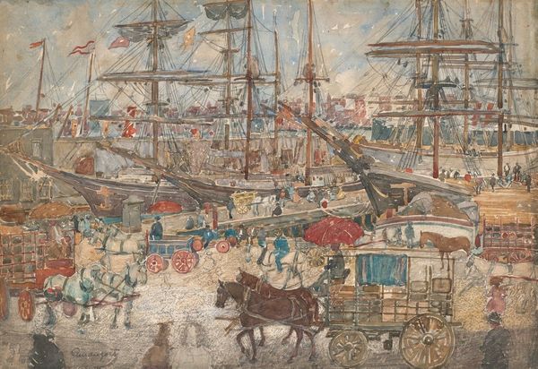 Editor: Karl Edvard Diriks' "From Christiania Harbour," painted in 1912 using oil on canvas. The sky seems to glow faintly, somehow, amidst the scene. All those ships at harbor create such a dense composition. What captures your imagination in this particular cityscape? Curator: You know, it’s funny, I look at that soft, luminous sky and feel this…anticipation, almost. It's as if the painting isn't just *showing* us the harbor, but hinting at what might sail into it next. The ships huddled together suggest a vibrant story, a mix of industry, maybe even a bit of longing for open sea, don’t you think? What kind of mood does all the detail conjure in *you*? Editor: I agree about the story! The detail is fascinating, a real snapshot in time – it's so dense, a bit overwhelming, truthfully. Maybe, for me, that detail almost grounds the anticipation. It feels more like a moment captured, rather than a portal to the future. I wonder, did Diriks intend this more as observation, or does he convey a specific political view through it? Curator: Oh, now that's an interesting turn, thinking about politics! Diriks was painting at a time when Norway was asserting its own national identity, recently independent. That harbor isn’t just a collection of ships; it’s a symbol of trade, of connection to the wider world. What did independence mean? This bustling port helps express how it felt to participate more in international dialogues. Still, isn't it amazing how a seemingly simple scene can spark such different thoughts and interpretations? Editor: Absolutely. Thinking about national identity does add another layer. So much to consider when looking closely! Thanks for untangling some of it with me. Curator: My pleasure! I, too, learn every time I delve into artwork. Perhaps this little journey will spark fresh perspectives as we navigate the world today.