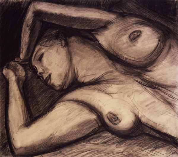 Edvard Munch made this print, titled "Vampire I," using lithography, a process that's all about the tension between surfaces that attract and repel. Munch would have drawn his design with a greasy crayon onto a smooth slab of limestone. Then, he'd treat the stone so that only the drawn areas would hold ink, while the rest repelled it. The printmaker then dampens the stone, rolls ink over it, and presses paper against it to transfer the image. You can really see the hand of the artist in the final print. Look at the texture and the variation in line weight, which show the directness of the drawing process. Lithography, while a printmaking technique, allowed for a uniquely intimate and expressive mark. This challenges the traditional hierarchy that elevates painting over printmaking. Ultimately, it is the trace of the artist's hand and creative decisions that brings emotional depth to the work.