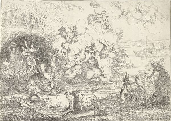 Willem Basse created this print, a "Bacchanal with a Dancing Couple on the Right," in the 17th century. It presents a scene brimming with figures associated with Bacchus, the god of wine and ecstasy. We see satyrs playing music, nymphs reclining, and couples dancing wildly, all symbols of unrestrained celebration. Consider the dancing figures crowned with ivy. This echoes ancient Roman festivals where followers of Bacchus, or Dionysus as he was known in Greece, donned ivy wreaths as a sign of devotion and altered consciousness. These bacchanals, or Dionysian rituals, were meant to transport participants to a state of divine frenzy. The imagery here is not unique but part of a continuous thread; similar scenes can be found on ancient Greek vases, Roman frescoes in Pompeii and Renaissance paintings. This echoes in us feelings of liberation and ecstatic communion, reflecting a deeper, collective memory of human desire for transcendence. It is a visual echo resonating across millennia.