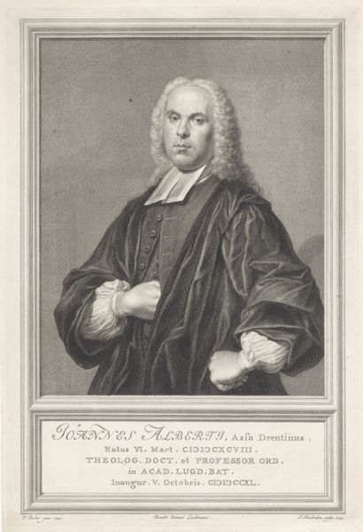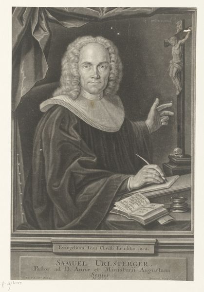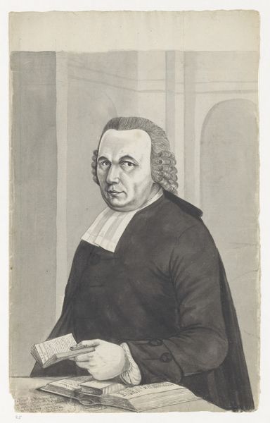 Curator: Here we have Nathaniel Smibert's "Portrait of a Cleric," an oil on canvas measuring just over a meter in height. The sitter exudes authority, doesn’t he? Editor: Indeed, but the overall muted palette strikes me as strangely melancholic. The cleric’s gaze feels weary, despite the formal pose. Curator: Portraits like these were crucial for establishing status in colonial society. The book is surely a symbol of knowledge and piety. Editor: And it speaks to the evolving role of the clergy within the social and political structures of the time, projecting learnedness. Curator: The book, the robe, and even the wig all work together as signifiers of profound dedication to God and community. Editor: But I wonder if the slight unease we feel comes from the tension between these carefully constructed symbols and the man's humanity? Curator: Perhaps so. It's a fascinating glimpse into the visual language of power and belief in early America. Editor: Yes, a reminder that even in idealized portrayals, human complexity always finds a way to surface.