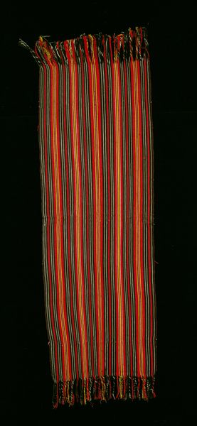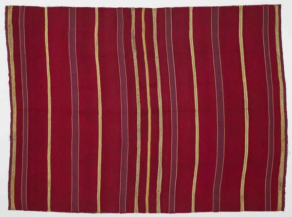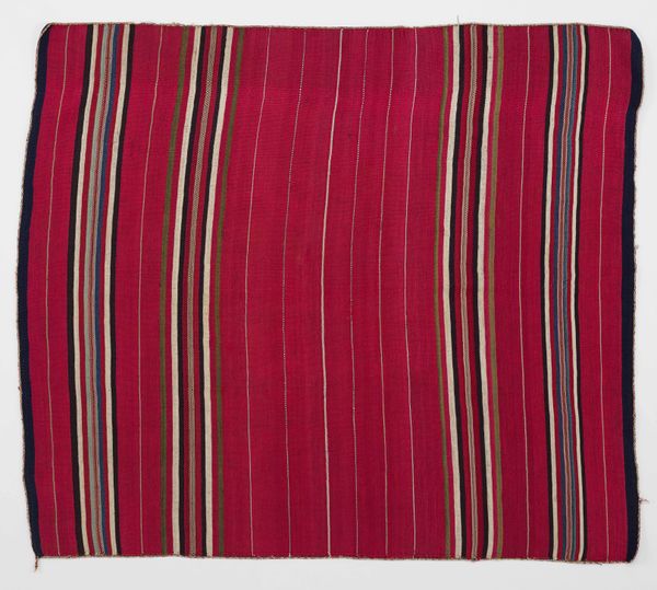 The Art Institute of Chicago holds this striking shoulder blanket, woven by a Navajo (Diné) artist. Its structure is dominated by vertical stripes, rhythmically alternating colours against a natural background. The overall effect is one of measured harmony. The composition draws from the Diné weaving tradition, which is not only an expression of artistry but also a deeply symbolic practice. The vertical orientation, in contrast to horizontal weaving traditions elsewhere, may suggest a connection to cosmological narratives, such as the verticality of the sacred mountains that define Diné territory. The repeated stripes can be read as a semiotic code, with colors such as red, yellow, and white, each carrying layered cultural meanings. The blanket's very form, designed to be worn, connects the individual to these wider symbolic systems, blurring boundaries between body, textile, and cosmos. In its quiet formalism, the blanket invites us to consider how textiles operate not just as utilitarian objects or artworks, but as complex sites of cultural production and meaning-making.