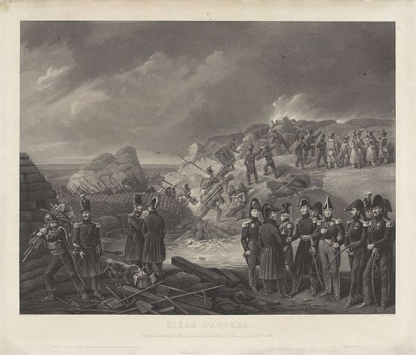 Nicolas Toussaint Charlet made this print called "Conquest of the Lunette of Saint-Laurent" in 1832. It shows a military scene, likely during a conflict involving French troops. Made in France, the image reflects the turbulence of the post-Napoleonic era. We see soldiers charging up a fortified hill, while others stand in formation below. The composition emphasizes the collective effort of the troops. Charlet specialized in military subjects. He aimed to capture the everyday life of soldiers, as distinct from heroic battle scenes. Prints like this served a crucial public role at the time. In a period of revolution and empire, images helped shape public opinion about the military. This print is likely to have been displayed and sold in commercial settings, rather than artistic ones. Understanding the print requires knowledge of French military history and print culture. This print can be understood by researching the battles and political events of the time. We need to know how images like this one circulated and influenced ideas about nationhood.