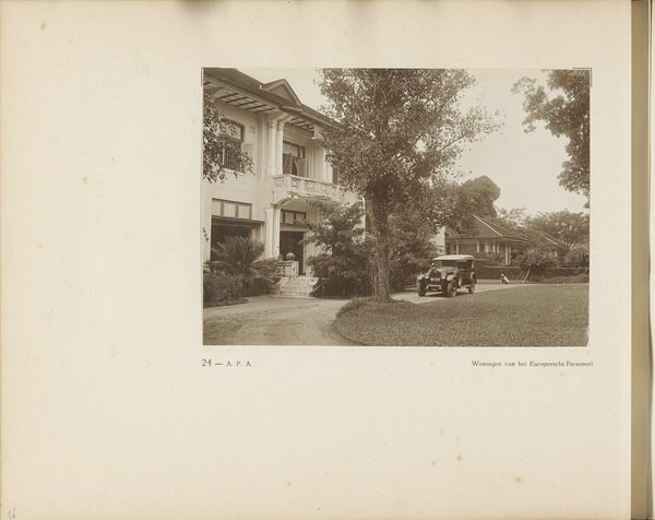 Curator: Looking at this stereoscopic gelatin silver print by Hermann Selle, titled "Pension op de Stubenberg," likely taken between 1868 and 1890, I'm immediately struck by its quiet, unassuming presence. What's your take? Editor: It feels very posed, almost like a stage set rather than a captured moment in time. The subdued tones certainly lend to a nostalgic, even melancholic, atmosphere. What's intriguing to me is the carefully arranged scene—the building, the people, even the placement of the trees seem to be orchestrated to convey a specific narrative about life and leisure during the period. Curator: The landscape certainly embodies a very controlled natural aesthetic, reflecting a period keen on rationalising space and its utilization. Even the people, appearing rather still, reinforce the symbolism of stability and order, common ideals promoted within bourgeois culture in late 19th century photography. It almost reads like an architectural record intertwined with social documentation. Editor: Exactly. We see here a visual embodiment of the social stratifications and gendered roles that were prevalent at the time. The fact it is titled "Pension," we see it's not merely documenting a space, it sells an experience, a place of retreat. Who was this retreat marketed to, and what was implied within this idyllic portrayal regarding class and accessibility? Was this a deliberate act of portraying exclusion? Curator: That's a great point. A 'pension' was more than a lodging; it symbolised a specific lifestyle, connected with leisure. We see this echoed in artistic tropes of Romantic landscape painting, translated through a relatively newer photographic technology to imply something profound: a way of belonging to nature through constructed experiences. It hints at constructed identities mediated through these experiences. Editor: And let’s remember that gelatin silver prints, as a medium, enabled mass production of images like this. Therefore this "staged" experience, laden with implicit values about social order and accessibility, had a wide distribution. How does this then feed into notions of national identity and what constituted a valuable German landscape? Curator: Indeed. The act of capturing and widely disseminating images like these cemented perceptions of desirable locations within the collective imagination. The 'Stubenberg' then morphs from being merely a location into becoming an emblematic locale - where certain social identities can express belonging. Editor: So, through the careful placement of compositional elements within what appears to be a simple landscape photograph, Selle has embedded and distributed coded messages about class, gender, and identity during his time. Curator: Precisely! A fascinating glimpse into both art and social structure, encapsulated in a single image. Editor: Food for thought, certainly. Now I want to visit this pension, with my own contemporary perspective, and dissect what it signifies today.