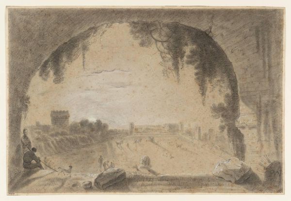 Curator: The Rijksmuseum holds this intriguing engraving, “Binnenplein met een hond om een paal heen rennend,” attributed to Isaac Weissenbruch, though its exact date of creation is a little unclear, circa 1836-1912. It’s quite the slice of life, isn't it? Editor: It strikes me immediately as oddly charming, like a glimpse into a miniature, self-contained world. The textures achieved through the engraving technique really bring the scene to life, especially in the dog’s frenetic movement and the roughness of the surrounding wall. Curator: Yes, that contrast is critical! It’s fascinating how Weissenbruch uses a relatively simple composition to evoke such a specific social milieu. Note how the central pole creates a focal point around which daily life orbits—a symbol, perhaps, of community. Consider the rise of genre painting. These glimpses into Dutch life became a means of cultural definition. Editor: Precisely, but what intrigues me more is the visual rhythm. The circular wall pulls your eye around the composition, leading you to the chasing dog and ultimately grounding you back at the central pillar. I’d argue that the repetition of forms is fundamental to its success as a unified picture plane. Curator: Certainly, but remember the political and cultural power embedded within such seemingly innocuous scenes! Genre painting offered patrons a vision of stability, domesticity, and even moral instruction. Weissenbruch, by placing this domestic scene within the controlled bounds of the engraving medium, participates in and perhaps critiques this broader project. The print, designed for consumption and circulation, had political implications. Editor: Interesting perspective! But back to the visual dynamics; the use of light and shadow, limited as it is within the engraving medium, gives an unexpected depth. That long shadow cast by the central pole actually structures the pictorial space by bisecting it horizontally and drawing the eye further into the courtyard's dimensions. Curator: Ultimately, what we see here is an artwork reflecting and shaping societal norms. From its probable place in a bourgeois home to its presence now in the halls of the Rijksmuseum, this print is testament to art’s ability to shape our understanding of the everyday. Editor: Absolutely. And while it's been illuminating to consider its societal echoes, the subtle ways its structure dictates meaning offers enduring satisfaction. A reminder, perhaps, of how both the social world and artistic mastery are woven from shared visions.