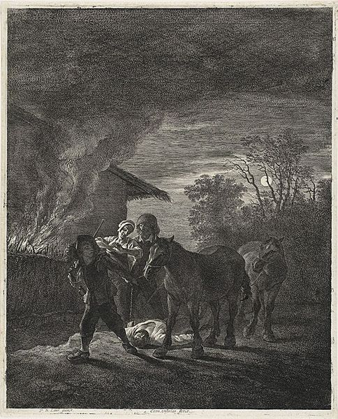 Cornelis Visscher created this print, Paardendiefstal, or "Horse Theft", sometime in the mid-17th century. The print depicts three figures stealing horses at night, while a fire burns in the background. Prints like these were widely circulated in the Netherlands and beyond, and they reflect anxieties about social order and morality. The Dutch Golden Age saw a rise in prosperity, but also growing concerns about crime and social inequality. How might these concerns have shaped the production and reception of this print? The dramatic lighting, typical of the Baroque style, heightens the scene's tension. The image creates meaning through visual codes and cultural references, drawing on the long history of art depicting crime and punishment. Historical crime documents might reveal the social attitudes toward horse theft during this period. By exploring the historical context, we can better understand the meaning of this work.