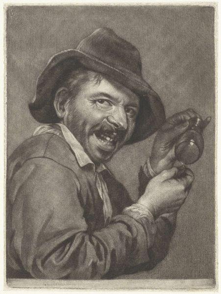 Jan van der Bruggen’s monochrome print, "Man met een leeg glas (de Smaak)", presents an intense study in contrasts and textures. The composition, dominated by the figure’s expressive face, invites an immediate, visceral reaction. Observe how the artist uses light and shadow to sculpt the man’s features, the deep blacks of his hat and eyes set against the stark white of his teeth. This contrast is not merely descriptive; it’s a semiotic device, creating a visual push and pull that animates the image. The rough texture of the printmaking enhances the raw, unfiltered emotion conveyed. Van der Bruggen uses the form to destabilize established meanings. Is this a celebration of simple pleasures or a commentary on the emptiness of sensory experience? This ambiguity is crucial. The empty glass becomes a signifier, open to multiple interpretations, challenging fixed notions of value and satisfaction. Ultimately, the work’s power lies in its formal structure, prompting us to question the relationship between form and content.
