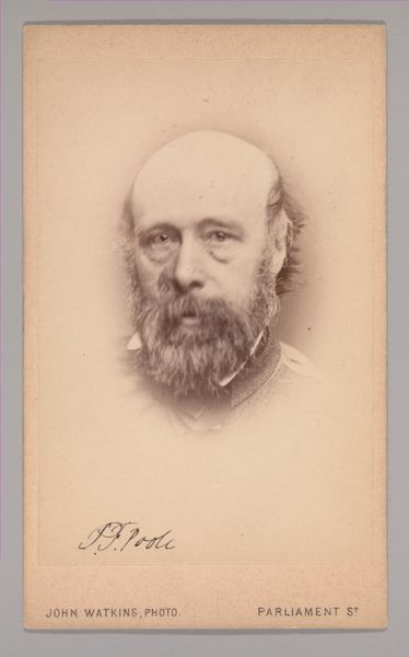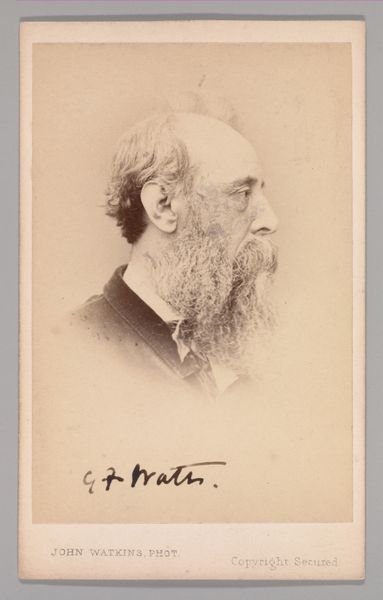 Editor: We’re looking at a gelatin silver print portrait of Charles West Cope, taken in the 1860s by John and Charles Watkins. The texture looks incredibly smooth, and the tones range from almost white to deep sepia. It has a very…contemplative mood, don't you think? How do you interpret this work? Curator: Indeed. If we bracket its subject momentarily, notice the photographers' exquisite control of tonal gradations. The diffused light sculpts Cope’s form, guiding our eye across the planes of his face, down to his hand and the delicate gesture where finger meets beard. Consider how that same delicate tonal contrast separates him subtly from the background, avoiding any harsh division or line that might interrupt the meditative unity. What effect is created? Editor: Well, the lack of a harsh line really does keep me focused on him, and on that hand-to-beard gesture, but the light is pretty simple overall. Is that by design? Curator: Precisely. The even illumination serves not to flatten the image but, paradoxically, to foreground the gradations. It allows for meticulous modulation within a tight register of values. A formal economy, would you agree, elevates what could have been a prosaic depiction to an exploration of photographic values themselves. And further: is there, in this highly specific balance of tonal control and composition, any sense of what photography could accomplish? Editor: I guess the success in modulating tones does emphasize what makes it photographic, like a pure study in the medium. I’ll be paying more attention to gradations now. Curator: As will I. Looking at this image, I see that a fresh focus on those simple choices is the foundation for so much more.