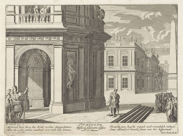 Jean Lepautre made this print, "Pyreneus en de Muzen," using etching techniques, a process intimately tied to the rise of print culture and wider dissemination of images. The etching method involves coating a metal plate with wax, drawing through the wax to expose the metal, and then bathing the plate in acid, which bites into the exposed lines. Ink is then applied to the plate, filling the etched lines, and the surface is wiped clean. Finally, the plate is pressed onto paper, transferring the image. The fine lines and intricate details of Lepautre's print speak to the skilled labor involved in its creation. The process, though seemingly simple, demands precision and control. It also suggests a context of mass production and consumption, where images could be reproduced and distributed widely, influencing aesthetic tastes and shaping cultural narratives, reflective of emerging capitalist structures and consumer markets. The importance of these processes lies in understanding how these modes of production impacted the dissemination of art and ideas during Lepautre's time.