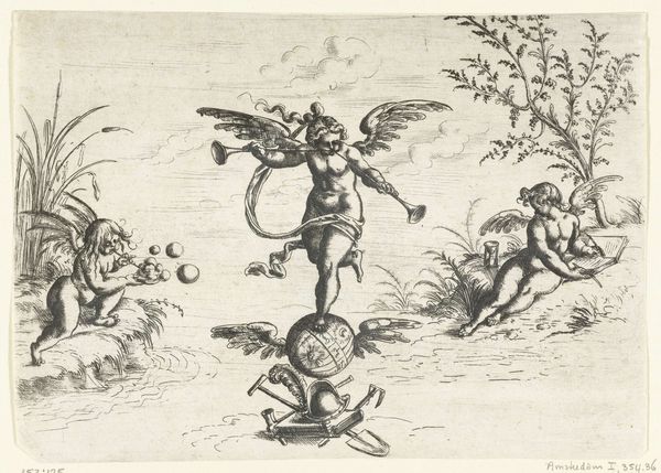 Curator: Before us, we have a piece titled "Three Embracing Putti on a Clover-Shaped Plateau," likely created between 1573 and 1610, attributed to Christoph Jamnitzer. It’s an engraving, a print, exploring allegorical themes and figuration within a baroque aesthetic. Editor: My initial feeling? A slightly unsettling lightness. It’s whimsical but with a weird militant edge. There's almost too much detail jammed in—those tiny trees seem plucked from a fever dream. Curator: Precisely. Observe the careful use of line and texture. The contrast between the smoothness of the putti’s bodies and the detailed ornamentation of their surroundings generates tension. Consider, too, the iconographic program. A winged figure in full military garb occupies one side, a flag-bearing putto on the other, flanking this central cluster. Editor: The military guy… he’s hilarious! And his face is very severe for standing naked next to a tiny fir tree! Those clover-shaped pedestals remind me of cake stands—maybe this scene is some weird birthday party from hell. It all feels deeply performative and allegorical, but it is strange. Curator: Indeed, one reads into the baroque celebration of abundance and spectacle, with these classical figures performing specific, possibly obscure, symbolic roles. The formal dynamism inherent in their intertwining form acts to engage the viewer through artifice. The clover form on which the cherubs embrace lends further emphasis to this artifice by means of calculated irregularity. Editor: So, is it some Renaissance comment on... childhood innocence confronted by war, rendered through the aesthetics of party supplies? It is like a dream and the closer you examine its elements, the weirder the whole thing gets. But you can’t tear yourself away. Curator: Perhaps it’s a symbolic contemplation of youthful virtue beset by earthly conflict, encapsulated within the decorative sensibilities typical of the era. Editor: So we end up where we began—lightness laced with unease. And just when I think I get it, it melts away, leaving me delighted by the artistry of its chaos. Curator: Agreed. A perfect summation of its intricate allure.