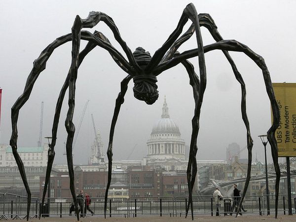 Editor: Louise Bourgeois' *Spider*, dating from around 1996-97, constructed with metal, just absolutely dominates its space. Its scale, juxtaposed with the leafy environment, is pretty unsettling, even terrifying. What strikes you most about it? Curator: You know, terror isn't necessarily the only pathway in. I think this piece, on a deeply personal level, reflects the artist’s own complex relationship with her mother. It's an ode, of sorts. A celebration of her strength, skill as a weaver, and her protective nature. Look at the spindly legs – are they threatening, or embracing? It's that very duality that grabs me. What do you make of the material? Does the metal speak to you at all? Editor: Metal, of course, suggests industrial, unyielding, even cold. Which kind of complicates the idea of a maternal figure, I guess. I suppose that tension is sort of the point? Curator: Exactly. Life’s messy. Maternal figures are rarely straightforward saints, are they? The cage-like body – does it trap, or protect? And even spiders, creatures so often feared, are master architects and providers. The work really sings to me through those ambiguities. It invites you to linger with difficult feelings, maybe? Editor: Huh, I guess I hadn’t considered how nurturing a spider could be. Maybe there's something profound about acknowledging both the scary and caring aspects of, well, pretty much everything. I’ll never look at a spider the same way. Curator: Or our mothers! Which is, after all, what great art does; it forces us to rethink the world.
