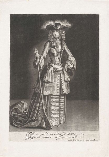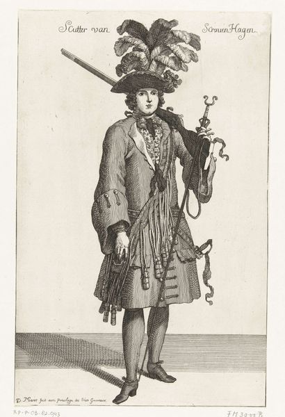 Editor: This is "Portrait of Willem Hyacinth, Count of Nassau-Siegen", an engraving by Pieter Schenk, made sometime between 1685 and 1711. It’s quite formal, the Count seems rather serious. How do you interpret this work, looking at it from your perspective? Curator: Well, seeing as it's a portrait destined, presumably, for public view, we have to consider the performative aspects of it. Think about the target audience and the political climate of the period. Editor: Right, I was thinking about that. What was the message that they were trying to convey? Curator: Precisely! Willem is meticulously styled in fashionable garb; every element screams wealth, authority, and connection. Do you see any signifiers of power at play in this portrait? Editor: Definitely. The cane, the hat, and the elaborate clothing all emphasize his status, right? Is it typical for portraits of this period? Curator: It’s a performance of status but also a reflection of artistic patronage. Portraits such as this one were meant to visually establish and reinforce social hierarchies. This portrait isn’t simply about individual likeness, it's about constructing and broadcasting power. Notice that inscription on the bottom, it establishes a link between names, families, and even regions of leadership, solidifying social order. Editor: That’s fascinating! It's much more than just a picture, it's like a statement. Curator: Exactly! It encapsulates the complex interplay between art, power, and social messaging. It also helps us understand how representations like this solidify social order and justify positions of power. Editor: I’ll never see a portrait the same way again! It's amazing how much context shapes our understanding.