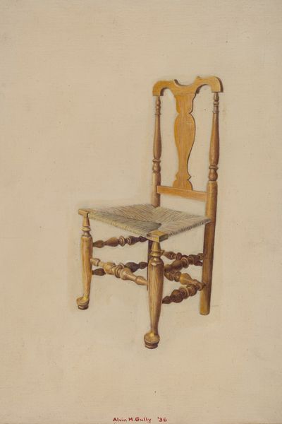 Curator: So, before us, we have Ralph Morton's "Dining Room Chair," a piece believed to be from around 1939. Editor: There's something instantly calming about this image. The soft hues, the unassuming subject…it feels like stepping back into a simpler time. What medium did Morton employ? Curator: Morton used a combination of pencil, charcoal and watercolor to realize it. You can clearly observe how he utilized varying weights to show off both material substance and fine detailing. Editor: The chair itself— such a commonplace object, transformed through the artistry of both crafting and rendition. I mean, the woven seat, those delicate curves. There is immense craft. What more can you tell me about the historical situation this artwork emerged from? Curator: Well, this was during the tail end of the Great Depression, and into the first inklings of World War II for other countries—a time when people focused perhaps more on their immediate surroundings, the home. I get a very subtle nod towards American Regionalism in terms of theme and intent. A focus on localized existence. Editor: Absolutely, it's about appreciating what you have and seeing the beauty in the everyday, almost turning it into high art, like…elevating domestic life but not erasing the inherent labor that builds it up. Consider how many hours went into both creating this singular object. Then think about the hand and skill to create such a photorealistic likeness! Curator: Yes, it asks questions about artistry: from manufacture of furniture to visual capture. It dances between artistic practices… Is it functional object? Aesthetic object? I am unsure which Morton prioritized when committing this moment to paper. But his ability to coax the play of light on wood is extraordinary, don’t you think? Editor: Definitely. I came for the simple quietness of the composition, and have since left considering all the invisible hands that produced this object we take for granted daily. Curator: Likewise! A chair seems so…unassuming. Yet, like all artistic captures of functional objects, so many narratives about craftsmanship and historical contexts swirl beneath its serene surface.