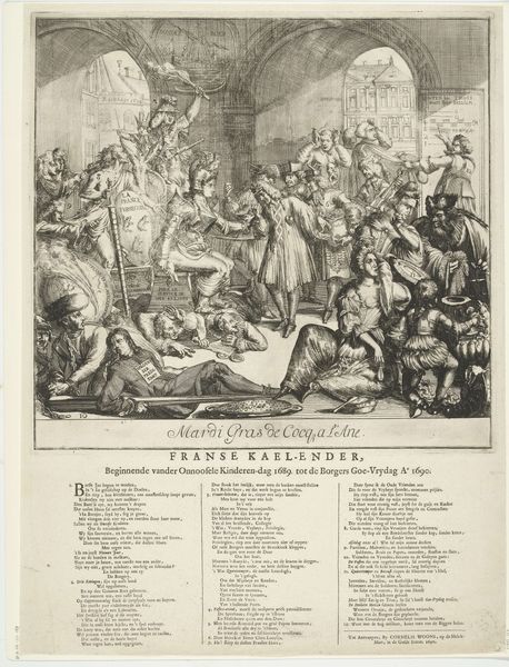 This is a 1689 print from an anonymous artist at the Rijksmuseum depicting the flight of James II to France. The composition is a flurry of linear detail, organized through a dramatic contrast between foreground and background. Note how the artist uses the foreground to present a stage-like setting, crowded with figures rendered through sharp, etched lines. These forms feel somewhat chaotic, yet they are anchored by the solid architectural forms in the background. These structures offer a sense of depth and order which sharply counterpoints the disorder that the fleeing figures evoke. The semiotic play within the image is fascinating. The fleeing king, adorned in elaborate garb, becomes a signifier of displaced power. This print uses satire to destabilize the traditional notions of royalty and authority. By emphasizing the chaos and disarray, it subtly questions the legitimacy of James II's rule, reflecting a broader discourse about power, legitimacy, and the shifting political landscape of the time.