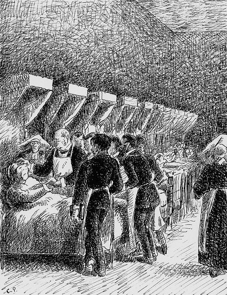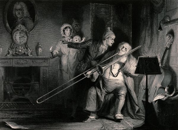 Curator: This captivating piece, “Underjordiske,” comes to us from the hand of Theodor Severin Kittelsen. Done in ink and pencil, it feels almost like a glimpse into a forgotten folktale. What's your immediate take on it? Editor: Chilling. There’s a pervasive sense of unease. The hatching gives everything a coarse, almost frantic texture. The whole scene seems cloaked in shadow, illuminated only by a small candle, emphasizing this feeling of a clandestine meeting in some backwater area of an obscure village. Curator: Absolutely. Kittelsen’s work frequently explored the darker aspects of Norwegian folklore. Given its fairy-tale moodiness and clear influence from Romanticism, it really evokes a sense of national identity that intertwines deeply with the supernatural. We can read in his work the anxieties and fascinations surrounding cultural preservation and identity in Norway. Editor: It’s fascinating how the positioning of the figures underscores a potential conflict of interest, the figures in the back watching over a swaddled babe who appears to be sleeping in a crib. We are drawn into a psychological study of paranoia from which our current political moment can glean something about a society and how the population deals with the ‘other’. I’m drawn to think about gendered dynamics, as the two primary characters at the opening look feminine. Perhaps it reflects a historical anxiety concerning women's autonomy and their reproductive power within society, don’t you agree? Curator: Indeed, and those anxieties often manifest through the demonization of midwives, and cunning folk and people who might be otherized because they practice the darker arts. Kittelsen clearly utilizes those anxieties through these uncanny looking trolls in their hideout or cave dwelling in which something, clearly not of this world, will imminently take place. Editor: I think we’re clearly directed through an exploration of the construction of monstrosity here as well. We, the audience, become implicated in this narrative by casting judgment, while also confronting our anxieties towards mortality and the unknowable facets of human existence. Curator: Yes, art offers us that uncomfortable reflection. "Underjordiske" holds up a distorted mirror, forcing us to confront our deepest fears. Editor: In the end, this is what renders "Underjordiske" eternally pertinent to debates on power, identity, and the shadowy corners of our societies. Thank you for this stimulating journey.