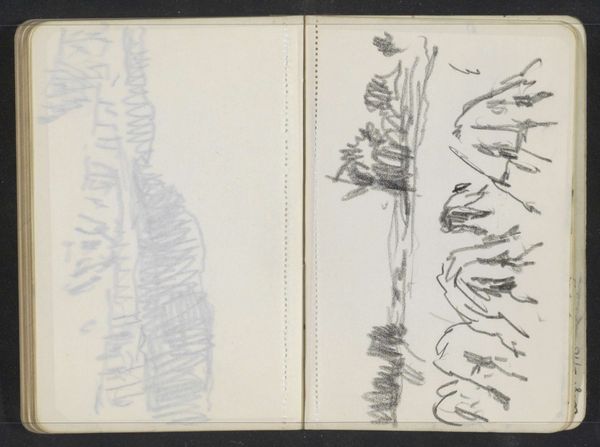 Curator: This is Alexander Shilling's "Landschap met bomen," a pencil drawing on paper dating back to the 1900s. Editor: Oh, this gives me such a quiet feeling, almost like stumbling upon a forgotten corner of a garden. Curator: Indeed. What strikes me is how Shilling reduces the landscape to essential lines. You can see it’s primarily pencil on paper, typical sketchbook fare. Editor: Yes, that minimal approach! It reminds me of a poet's first draft, capturing just the bare essence before embellishment. The tree on the right feels so present, while the others almost fade away. Curator: Precisely! The form is deliberately exposed by a simple mark making, highlighting the materiality of both the pencil and the paper and allowing us to follow the labor of its making. Think of the availability of paper and pencils at this time. Editor: That’s true! It also strikes me how raw it is. Like he captured the idea of the landscape. No attempt to smooth or prettify. More about experiencing and remembering nature. Curator: Perhaps, or even recording and inventorying the landscape and nature itself. He's actively using the language of line. These rapid notations speak volumes about artistic process and intent, the act of rendering landscape, accessible, personal and portable on these unbound sheets. Editor: That is something! It makes me wonder, what exactly was he seeing, hearing, even smelling when making this? It certainly doesn't look finished, yet is so complete in and of itself. It is beautiful in an unfinished way. Curator: I would agree. These open, light renderings provide insight into Shilling's practice and understanding of material culture and its intersection within fine art. Editor: Definitely! Looking at "Landschap met bomen" through your eyes allows for a new awareness that elevates the materials used beyond the usual perception. It's not just a pencil sketch but so much more. Thank you!