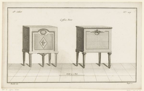 Nicolas Dupin made this print of two chiffonieres, or small cabinets, using etching and engraving techniques. The image reflects the cultural context of 18th-century France, where furniture design was closely tied to social status and aristocratic taste. Prints like this served as a vital form of communication between designers, craftsmen, and patrons. They also played a part in shaping consumer desire in a burgeoning market for luxury goods. Notice the elegant lines and ornamentation of the cabinets: such features spoke to the values of refinement and sophistication prized by the French elite. Dupin's print also speaks to the institutional histories that shaped artistic production. As a design, it was part of a broader system involving academies, workshops, and trade networks. To fully understand the print, one might consult period inventories, trade publications, and design treatises. These resources would allow us to understand the social and institutional factors influencing the creation and consumption of such objects.
