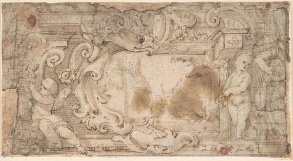 Curator: Here we have a delicate design study, “Design for a Carved or Openworked Frame with a Variant," created between 1652 and 1725 by Giovanni Battista Foggini. The work resides in the collection of the Metropolitan Museum of Art. It's rendered using pen, pencil, and a watercolour wash. Editor: You know, looking at it, it feels almost unfinished, in a good way. Like I'm seeing the artist's raw thought process, all the little flourishes and hesitations laid bare. It's…vulnerable, maybe? Curator: I see what you mean. Its vulnerability is partly born from the history of design itself during the Baroque period. The emphasis shifted towards dynamic compositions, where the frame was just as important, aesthetically, as the artwork it was designed to contain. This drawing becomes evidence of that aesthetic struggle. Editor: Struggle, huh? To me, it's more playful than a struggle. I imagine Foggini doodling, almost absentmindedly, conjuring cherubs and swirling foliage. It feels spontaneous and light, despite all the meticulous detail. Curator: I'm drawn to consider how the cherubic figures in particular relate to larger cultural narratives, notably their complex symbolism linking innocence with powerful societal and religious ideals. It speaks volumes about the status of representation and image-making at the time. Editor: I always feel a bit conflicted about cherubs. They're supposed to be these symbols of purity, but they often feel a bit… cheeky, maybe? There's a knowing glint in their eyes in Foggini’s design that undercuts all the innocence! It almost suggests a subtle rebellion against rigid religious doctrines. Curator: It’s that tension that I find so engaging, too. To think, this piece sits at a critical juncture—the way art served as propaganda as it embraced individual creativity... It invites us to question inherited values. Editor: Yes, absolutely. For me it's this beautiful, slightly chaotic dance between intention and intuition. I could get lost in the tiny details of the openwork forever! It makes me want to create, which at the end of the day, must be a design's purpose, surely?