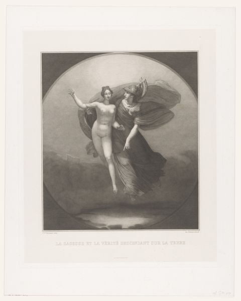 Editor: Here we have Hyacinthe Aubry-Lecomte's 1846 pencil drawing, "Studie begeleidt Genius," or "Study Guides Genius". The texture is fascinating; I'm immediately drawn to the almost photorealistic rendering achieved with just pencil. How does this piece strike you? Curator: Well, let’s consider the context. The artwork's materials—pencil on paper—belie the ambition of its allegorical subject. Notice how Aubry-Lecomte utilizes what appears to be humble materials to evoke such grandiose themes. Are we really only considering a high-minded concept, or rather labor invested through time, graphite and paper? The mass consumption of such ideas is perhaps enabled and also challenged, with a drawing produced laboriously with just one skilled artisan's hand. What would it mean for genius to need 'study', too? Editor: That’s an interesting perspective. I hadn't thought about the contrast between the medium's accessibility and the seemingly inaccessible concept of 'genius'. The nudity is striking as well, although I would presume allegories allow such things. Is there anything interesting to consider with respect to that, with relation to process or medium? Curator: Precisely. How does the labor of crafting the nude figure – labor itself perhaps seen as vulgar - elevate the social status or moral virtue of genius, which appears inherently elite. It almost turns the very definition on its head! Perhaps also, the easy accessibility and affordability of a pencil drawing - if purchased at scale as an illustration- belies its value, making the actual labour behind such things go unobserved. Editor: So, looking at the art-making process reveals potential class commentary in the way "Genius" and "Study" are constructed through labour and consumption... Fascinating. It gives new meaning to the concept itself. Thanks! Curator: Indeed, thinking about material conditions really adds new layers of interpretation, and makes us question assumptions.