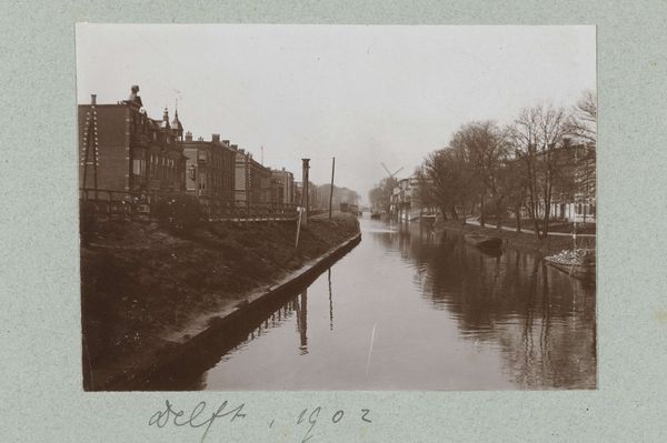 Curator: This photograph, entitled "Kade in Sneek", was captured by Folkert Idzes de Jong, circa 1905-1907. It presents a fascinating cityscape steeped in realism. Editor: My initial thought? This image feels so still. It’s as if the artist bottled a memory. The sepia tones and sharp focus make it simultaneously distant and present, if that makes any sense at all. It pulls you into this quiet moment by the water. Curator: It's interesting that you use the word 'memory', as Dutch photography of this period served partly as a documentary project, attempting to fix ways of life being eroded by the emergence of the modern state and the early growth of modern international capitalism. Editor: Ah, the grand narrative looming as ever! Perhaps it’s that sense of capturing something fading that hits me. Look at those figures gathered, tiny but discernible at the front of the buildings, all the comings and goings down the pier. It's a portrait of a community busy but almost frozen in amber now. Curator: The Dutch Golden Age aesthetic, with its focus on landscapes and everyday life, strongly influences the style. What I see here is de Jong subtly referencing that historical tradition while engaging with the industrial and social realities of his time. Note the canal, typical for the cities in Netherlands and also it has the steamboat and factories that begin to dominate the landscape. Editor: Yes, I’m now noticing the faint steamboat with plumes of what must be steam just belching forth... juxtaposed against the reflections of those stately buildings. And what's truly magical is how the reflection softens the architectural rigidity – creating an impressionistic feel out of stark realism. Curator: Exactly, that visual dance encapsulates a pivotal moment in Dutch social and economic development. It reveals the interplay between commerce, urbanization and their aesthetic rendering as a picturesque subject. Editor: You are totally right, it is as much as a document as a depiction of something picturesque, the way you pointed. Well, seeing it as both historical analysis and emotional snapshot enriches the picture further, wouldn't you agree? Curator: Indeed. The capacity of art, and particularly photography, to reflect societal change and evoke subjective experience makes images like de Jong's all the more precious. Editor: Couldn't agree more.