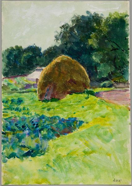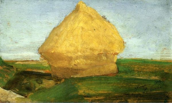 Editor: So, this is Berthe Morisot's "Haystack," painted in 1883 using oil on canvas. The immediate feeling is one of soft light and airiness. The haystack itself, despite its size, seems to blend with the surrounding landscape. What do you see in this piece that I might be missing? Curator: Consider the way Morisot orchestrates the formal elements. Note the juxtaposition of the impastoed haystack against the flatter, more diffused handling of the surrounding field and sky. The structural rigor is softened by a delicate, almost ephemeral, palette. Is the haystack merely a subject, or does it function as a compositional anchor? Editor: That’s a great point, I hadn't considered how deliberately the impasto contributes to that anchor. The texture really does draw your eye. The eye bounces between it, and then sort of wanders throughout the rest of the image because it is much less aggressive. It has the most visual weight. Curator: Precisely. The relationship between the texture of the impasto and its chromatic variations creates a powerful tension. Notice the strategic use of complementary colors-- how greens interplay with yellows and earth tones, lending vibrancy. Also the figures, which she places slightly behind and to the right of the Haystack: why might Morisot make that choice rather than placing the figures center? Editor: I imagine she did that to add visual interest and compositional balance, right? If the figures were centered it would shift from a landscape to more of a genre scene. It would change the dynamics and message of the painting. Curator: Indeed, you can feel her playing with the semiotics and the way it changes meaning through that strategic placement, it’s that push and pull between structure and freedom which makes this work particularly compelling. Editor: It’s amazing how much one can uncover simply by looking at color, form, and the use of impasto. I'll definitely pay more attention to those elements moving forward! Curator: And by attending to the nuanced visual language of a work, we may begin to understand its significance within a broader cultural landscape.