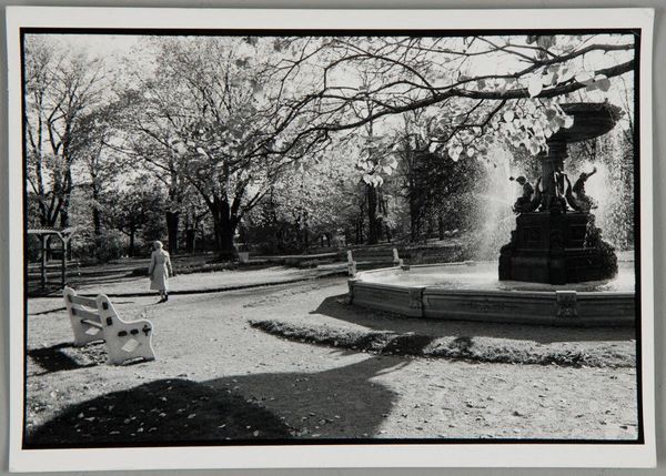 Editor: So here we have Robert Frank's photograph, "Picnic Ground—Glendale, California" from 1955, a gelatin silver print. I find the composition striking; a figure sits alone amidst the idyllic backdrop of a picnic ground, yet there’s an overwhelming sense of isolation. What do you make of this contrast? Curator: It's precisely that contrast which speaks volumes about Frank’s approach. This image comes from a period of intense social scrutiny and manufactured conformity. He's challenging the idealized vision of American life often presented in media. Notice how the lone figure is framed by the gnarled trees and… are those trash cans prominent in the foreground? Editor: Yes, they almost serve as sentinels framing the subject! It's a rather bleak counterpoint to the idealized notion of a picnic. Curator: Exactly! Frank's "The Americans," from which this image originates, deliberately showcased the underbelly of the American Dream. These images offered an outsider perspective, questioning established norms, which was particularly poignant during the Civil Rights Movement. Who had access to that "dream", and who was excluded? How might those exclusions impact a place, or a moment? Editor: It’s powerful how he uses a seemingly mundane scene to hint at larger social and political issues. It disrupts our expectation. Curator: It does, and that’s Frank's genius. He uses visual storytelling to expose complex social realities and prompts viewers to question the narratives they consume. Where do you see that kind of "storytelling" now? Editor: Well, in social media perhaps? Photos used to convey a curated version of reality. Curator: A parallel worth exploring! This revisiting the image has provided me a fresh insight. Thanks for pointing this out to me. Editor: My pleasure, this was fascinating. It is thought-provoking how Frank prompts us to see beyond surface appearances and explore the social undercurrents shaping American society.