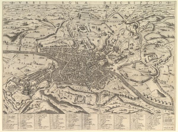 Nicolas Beatrizet created this print, "View of Rome from the West," sometime between 1551 and 1566. The composition strikes us first with its intricate, almost obsessive detail. Beatrizet uses line to map Rome, transforming the city into a dense network of architectural forms. Look closely at how Beatrizet renders the urban landscape. It’s more than just topographical; it’s a visual encoding of power and knowledge. The exacting detail of the lines serves not only to represent buildings and topography but also to assert a kind of control through documentation. This relates to the broader cultural context where mapping was both an artistic endeavor and a tool of political and social governance. Notice also the uniformity in the execution, which suggests an underlying philosophy that seeks to categorize and understand the world through systematic representation. The print destabilizes our sense of space, presenting a flattened, almost abstracted view of a bustling metropolis. This challenges traditional perspective, inviting us to reconsider how we perceive and understand urban space. The formal qualities of line and composition function here as more than just aesthetics; they become part of a larger discourse on knowledge, power, and representation.