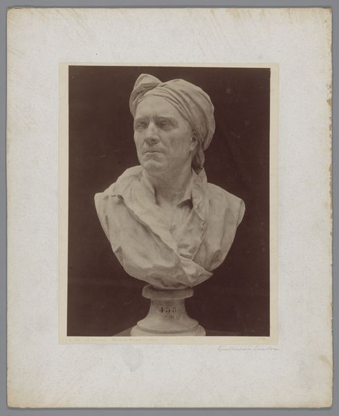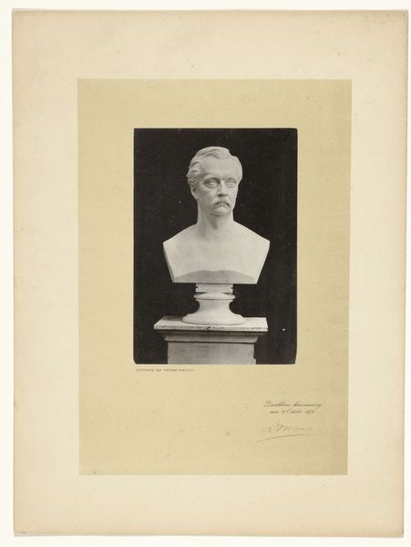 Curator: This gelatin silver print at the Rijksmuseum is titled "Buste van Sophie, prinses der Nederlanden." The artwork dates roughly between 1870 and 1949, its creator remains anonymous. Editor: My first impression is somber. The monochromatic tones lend it a historical gravity, a kind of preserved dignity in the face of time. The sculptural form captured photographically almost feels like a ghost from the past. Curator: Indeed. Busts like this became popular during the Neoclassical movement, reviving interest in Greek and Roman sculptures to immortalize the figures represented in them. Often times in the context of nobility, this speaks to power. Editor: Notice how the photographer, or perhaps the sculptor themselves, uses light and shadow to accentuate the folds in the fabric and the princess’s features. The chiaroscuro adds a dimension of depth, moving beyond just a straightforward representation. The details speak of more than mere presentation. Curator: You bring up a good point. These sculptures would immortalize a figure not just for their likeness, but their virtue as well. And we read this tradition photographically through how the image has been framed as a result. Consider how these Neoclassical artists and portraitists carefully considered the pose, garments, and presentation of their subjects in their day. Editor: I agree that the visual choices echo this pursuit. One can observe this tradition in portraiture even today. This visual syntax persists across different cultures even. This particular image freezes and intensifies these classical visual elements. It invites contemplation on identity. Curator: Precisely. This photograph encapsulates the psychological and societal weight borne by a princess within a particular cultural and historical moment. In its capture it tells stories about enduring cultural values of class and wealth as communicated through portraits. Editor: Looking again at how light models the princess’s face, and the sharp focus throughout this image I can better appreciate how technique serves that preservation of identity. Food for thought indeed.