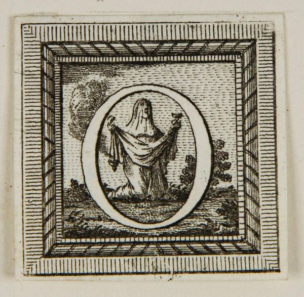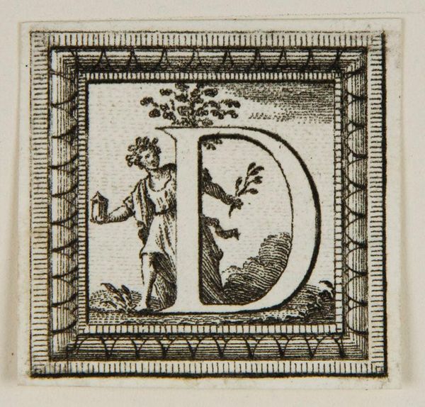 Curator: This intriguing print, titled "Letter I," presents us with an intriguing artistic puzzle, its creator unfortunately lost to history. Editor: My initial response is one of quiet contemplation; the figure seems withdrawn, almost melancholic, within the sharp linearity of the composition. Curator: Indeed. Consider that this piece likely functioned as part of a larger, utilitarian alphabet set, designed for mass consumption. The fine lines suggest meticulous craftsmanship. Editor: The frame itself is visually arresting! The linear motifs work to contain and intensify the stillness of the central scene. It all seems very deliberate. Curator: Such mass-produced items reflect the societal values placed on literacy and accessibility; the means of production democratizing knowledge. Editor: Perhaps, but this also showcases the beauty and expressive possibility within rigid structures, offering, even now, a moment for reflection on form and content. Curator: It's a fascinating blend of function and form, ultimately revealing social priorities within accessible design. Editor: Absolutely, a reminder that meaning is often found in the details of design and presentation.