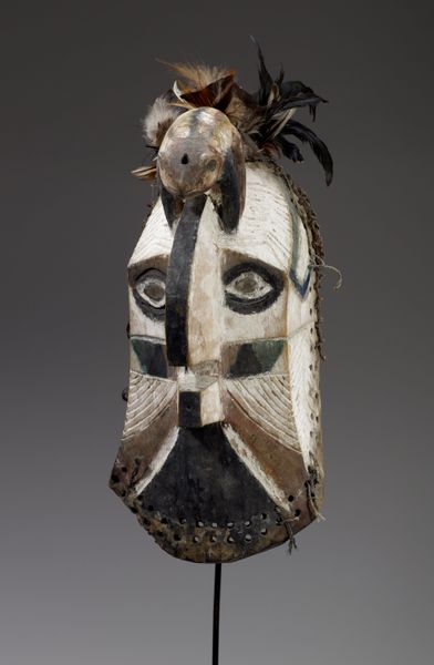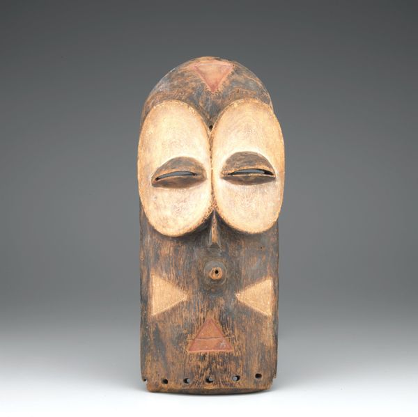 This is a Mbambi mask, made by the Pende people of the Democratic Republic of Congo. The Pende are divided into two major groups, living in different regions, with distinct dialects and cultural practices, which influence mask-making. This kind of mask is danced by young men during initiation ceremonies which signify the transition into adulthood. The mask may be the residence of a spirit, or represent an ancestral figure. The large oval shape of the face, the striking linear nose and brow, and the raffia fibers evoke a powerful presence. Red symbolizes life and vitality; it has the power to ward off evil. White, on the other hand, represents purity, peace, and the ancestors. Mbambi masks reflect the complex interplay between social structure, spiritual belief, and individual expression. The mask is not only an object of art, but a cultural artifact that carries within it the history, values, and aspirations of the Pende people. It is a reflection on identity, tradition, and the ongoing negotiation between the past and the present.