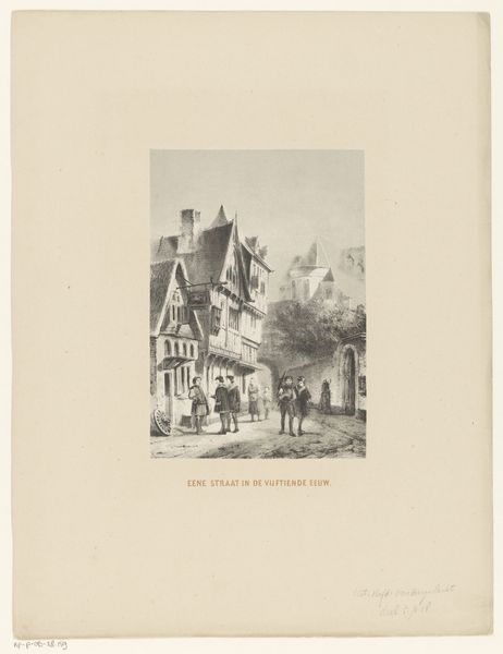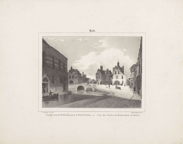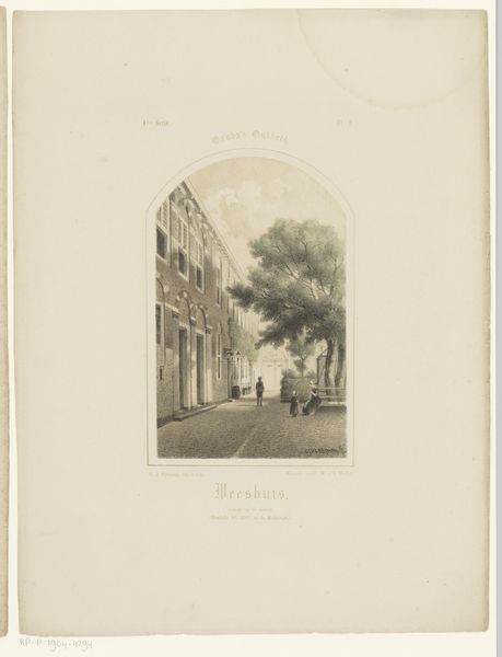 Editor: This is "View of the Barbaratoren in Gouda" by Gijsbertus Johannes Verspuy, created in 1859 using watercolor and drawing techniques en plein-air. I find the subtle greys and browns create a very peaceful, almost somber mood. What catches your eye in this piece? Curator: Note the deliberate framing created by the arched composition. It directs the viewer's focus inward. Consider also the artist's attention to linear perspective. It recedes convincingly into the background, yet the rendering remains quite delicate, almost fragile. Do you observe any inherent tension in this approach? Editor: Well, yes. The precision of the architecture seems almost at odds with the soft, fluid quality of the watercolor medium. It’s like two different artistic goals coexisting. Curator: Precisely. Observe how the tower itself acts as a vertical anchor, counteracting the horizontal pull of the street. The meticulous details of the brickwork on the buildings draw your eye to the middle-ground of the painting. These details fade towards the background where form gives way to tonality in the distance, creating atmosphere and space. What affect does the absence of vibrant colours create? Editor: I suppose that pulls you in too - it lends the scene a timeless quality, removing it from the present. It allows me to consider the pure geometric forms without the distraction of vibrant colour. Curator: An insightful reading. I appreciate how looking beyond surface representations reveals the power of Verspuy’s careful formalism. Editor: Thank you! I definitely learned a lot by really concentrating on the formal choices the artist made and how those choices contributed to the work as a whole.