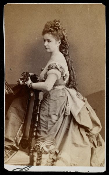 Curator: This is "Portrait of a Ballet Dancer," a gelatin-silver print taken around 1860 by Thomas Rice Burnham. Editor: Wow, she looks so fragile, almost like a porcelain doll caught in a sepia-toned dream. There's a delicate stillness to her pose. Curator: Indeed. Ballet, even captured in stillness, represented not just artistry but also cultural ideals of feminine grace and physical discipline. The romanticism style really plays into this. The flower crown too symbolizes purity and fleeting beauty. Editor: Yes, the floral wreath sits a little heavily on her head actually. Do you think it contributes to the impression of vulnerability I sensed at first glance? The elaborate costume too – the puff of the skirt and floral accents–feels performative. Curator: Precisely! And consider the rise of photography then – its potential to capture and preserve beauty, even construct an idealized reality for its viewers. Genre painting tropes merge in it. Notice the specific pose. Editor: I do, it's quite staged, formal, I suppose reflecting a specific taste. It has a certain melancholy about it. The sharp geometric tile contrasts oddly with her soft contours. It makes it more striking and adds to the sense of the photograph's period. Curator: That patterned floor could reflect a kind of artificial paradise too, an ideal of ordered beauty imposed over the natural. Every element is very carefully placed for an expressive intention, it becomes a symbolic construction. Editor: Maybe, it could also highlight how confining life was. She must practice long hours and this photograph froze one of such countless hours. It almost encapsulates an entire era’s artistic obsessions and also a kind of sorrow. Curator: An era obsessed with capturing a moment in time but equally fascinated by the symbols of immortality and beauty – two forces perpetually at play. This work brings them together in a striking fashion. Editor: Beautifully said. What seemed a simple portrait opens up these wider stories – quite haunting, I would say.