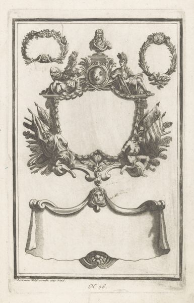Editor: This is "Embleem voor een Rotterdams kunstgenootschap," or "Emblem for a Rotterdam Art Society," dating sometime between 1745 and 1808, by Gerard van Nijmegen. It looks like an engraving, full of little details. What strikes me is how symmetrical it is, but with enough asymmetry to keep it interesting. What do you see in this piece, from a formalist perspective? Curator: The initial visual impact arises from the meticulous lines and calculated arrangement. Note the strategic use of curvilinear forms set against geometric elements. The composition balances decorative embellishments—garlands, tools of artistry—against the stoic circular frame. The success of the artwork lies in the strategic distribution of mass and space. Tell me, what purpose do you think is served by that blank oval in the center? Editor: Hmm, perhaps it's intended to hold a specific image, or maybe even text related to the Art Society itself? Is that asymmetry created just to add character, or does it convey more? Curator: Precisely. It offers a space for meaning to be inscribed later, an aperture awaiting content. The asymmetry avoids simple mirroring. The artist plays with our expectations, subtly disrupting the formal rigidity. Think of how the composition uses dynamic tension between stillness and movement, order and slight disarray, leading the viewer's eye around. Editor: So, the lines aren’t just decorative; they construct relationships between objects and imply motion. Curator: Exactly. The artist's mastery in the handling of the linear structure is evident in creating these intricate yet cohesive relations. It exemplifies the formal principles underlying visual language of 18th-century emblems, in which these devices are employed to establish value. It also brings into focus that even now the core principles remain to drive our interpretations. Editor: I never would have thought of it that way! It seems my analysis has more to learn about art and its composition, like yours. Curator: And I may look deeper into other points of view than my own! Art, as always, challenges our way of thinking.